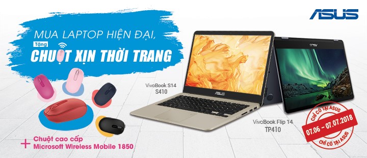 ASUS triển khai chương trình khuyến mãi: Mua Laptop hiện đại, Tặng chuột xịn thời trang. Qua đó, từ ngày 07/06/2018 đến ngày 07/07/2018, khách hàng khi mua một trong hai mẫu laptop VivoBook S14 hoặc VivoBook Flip 14 được phân phối chính hãng sẽ được tặng ngay một chuột không dây Microsoft trị giá 350,000 VNĐ. Chương trình áp dụng tại các đại lý trên toàn quốc và có thể kết thúc sớm hơn thời gian quy định nếu hết quà tặng.