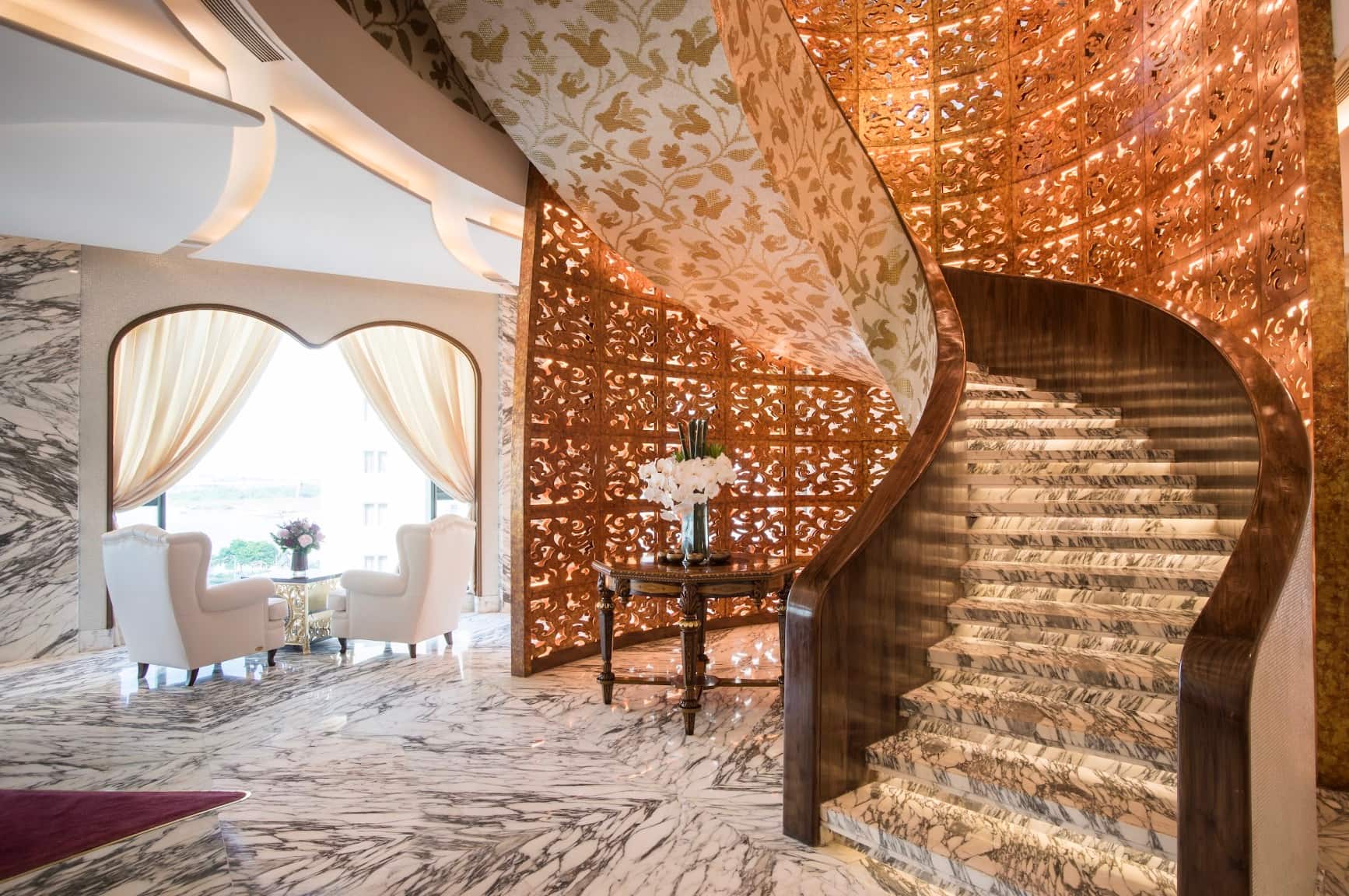 Ngay từ những bước chân đầu tiên, trải nghiệm đã được sắp đặt một cách đầy chủ ý. Những khung cửa kính chạm trần mở ra tầm nhìn hướng về dòng sông Sài Gòn êm đềm, tạo nên sự đối lập đầy thi vị với nhịp sống sôi động phía dưới. Nội thất Ý tinh xảo, đá cẩm thạch bóng mịn và những đường cong mosaic mềm mại dẫn lối ánh nhìn – và cả cảm xúc – về cầu thang xoắn ốc mang tính biểu tượng. Sự chuyển động nơi đây không chỉ mang tính vật lý, mà còn là một nghi thức – dẫn dắt mỗi người bước vào trạng thái nội tâm sâu lắng hơn.