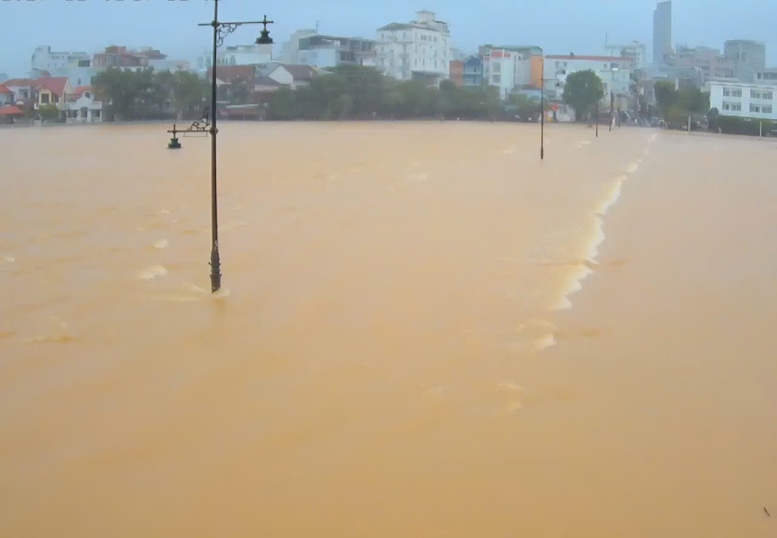 Mực nước trên sông Hương đang tăng cao tràn qua khu vực Đập Đá, TP. Huế.