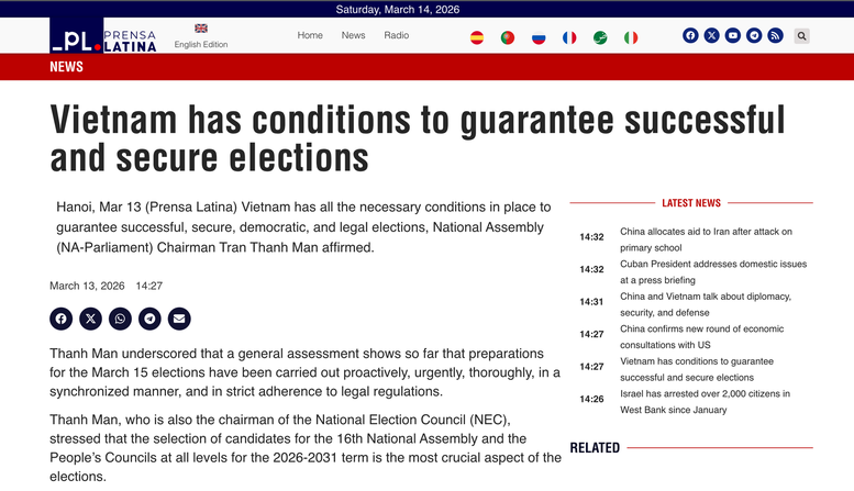 Tin tức về bầu cử của Việt Nam trên Prensa Latina. Ảnh chụp màn hình.