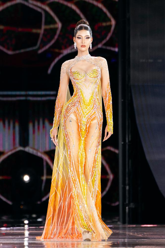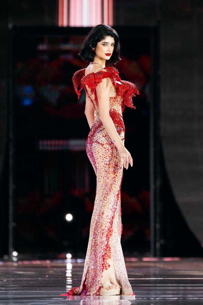Ngay sau đó, Top 10 Miss Cosmo 2025 chính thức xuất hiện trong những thiết kế Trang phục Dạ hội được đầu tư công phu. Trên sân khấu Chung kết, các thí sinh thể hiện sự tự tin, kỹ năng trình diễn và thần thái nổi bật, ghi điểm với Ban Giám khảo và khán giả.