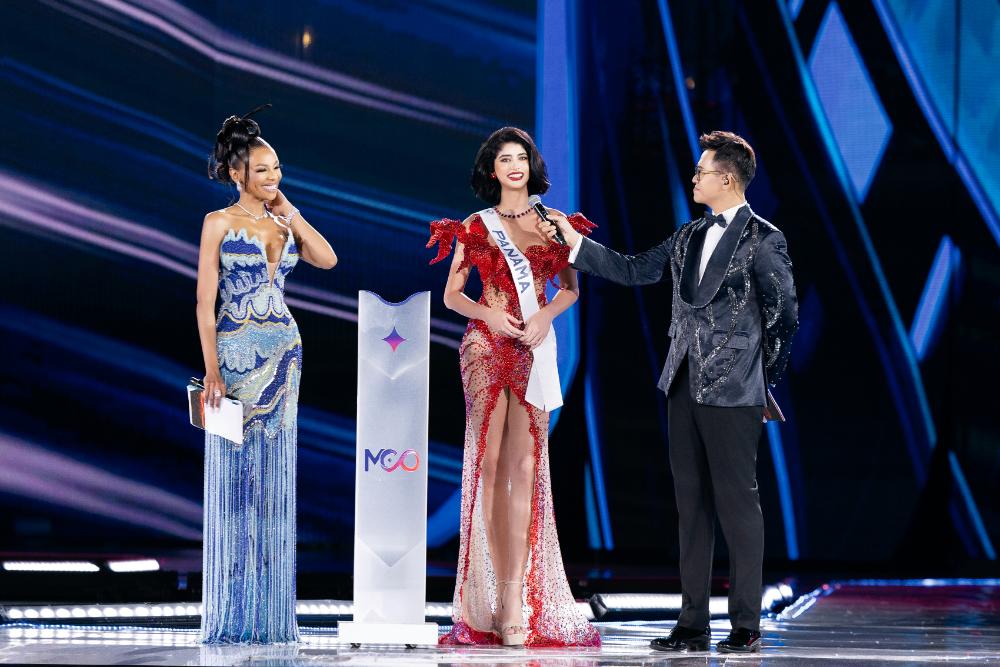 Sau phần trình diễn mở màn, sự xuất hiện của cặp đôi MC Bonang và MC Đức Bảo tiếp tục khuấy động không khí chương trình. Lần đầu tiên kết hợp trên sân khấu Chung kết Miss Cosmo 2025, bộ đôi ghi dấu ấn với lối dẫn dắt ăn ý, chuyên nghiệp, góp phần giữ nhịp cảm xúc xuyên suốt đêm thi.