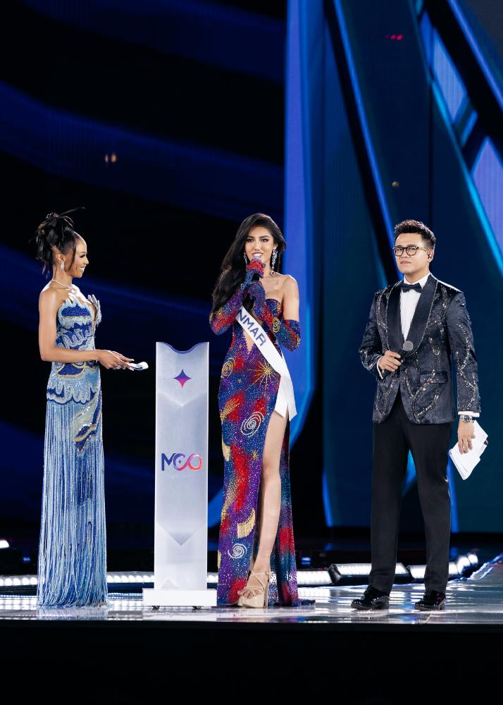 Sau phần đồng diễn mở màn, 71 thí sinh đồng loạt trở lại sân khấu trong không khí hồi hộp để bước vào thời khắc công bố Top 21 Miss Cosmo 2025. Dựa trên kết quả đánh giá từ Ban giám khảo tại Jury Session ngày 17/12, 21 thí sinh xuất sắc nhất đã chính thức được gọi tên. Trong đó, người đẹp Miss Cosmo Myanmar – Myint Myat Moe giành giải thưởng “Cosmo Social Ambassador” và được đặc cách bước tiếp vào Top 21.