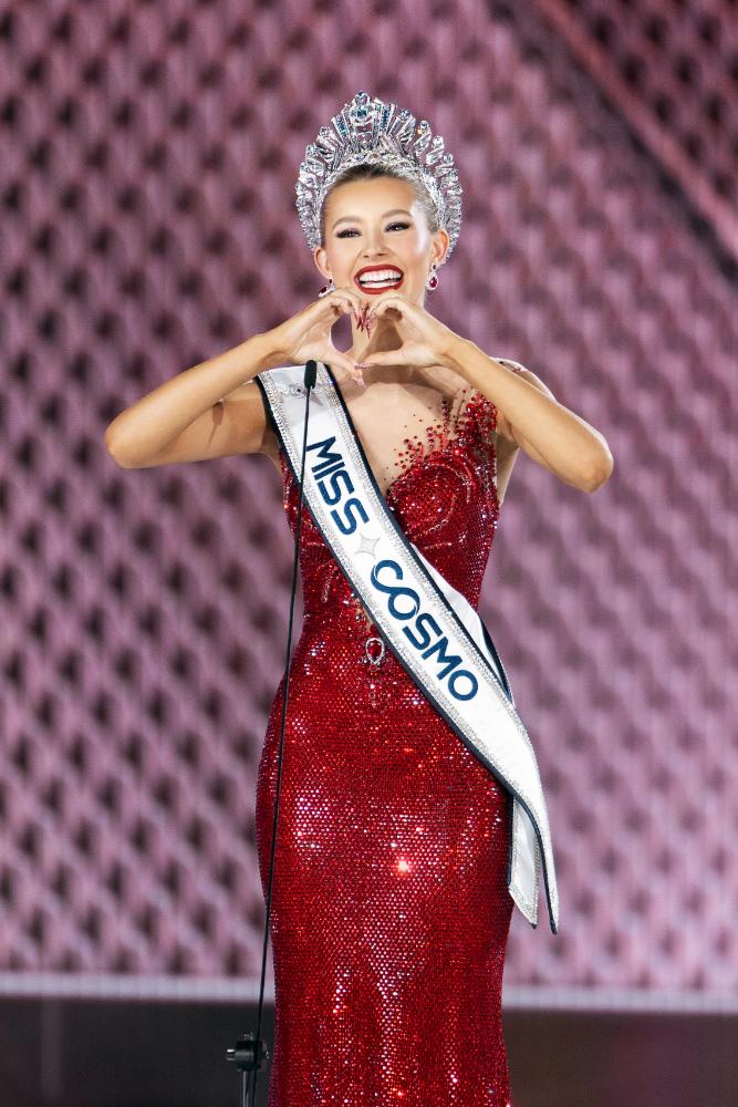 Chia sẻ về cương vị mới, Tân Hoa hậu bày tỏ sự biết ơn sâu sắc đến Hội đồng Giám khảo đã đồng hành cùng các thí sinh trong suốt những ngày vừa qua, đồng thời cho biết bản thân cảm thấy vô cùng may mắn và hạnh phúc trước cột mốc đặc biệt này. Dù thừa nhận không còn nhiều lời để diễn tả cảm xúc, Tân Miss Cosmo 2025 vẫn không giấu được sự háo hức khi nói về nhiệm kỳ sắp tới.
