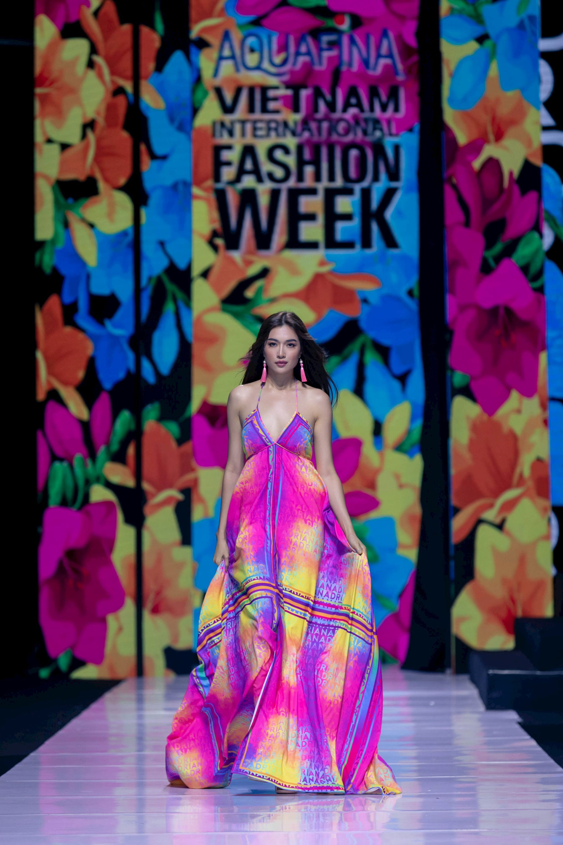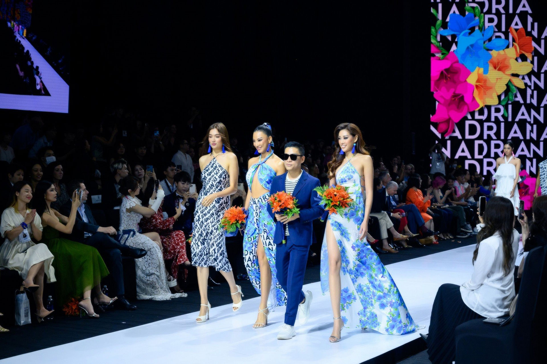 Chưa dừng lại ở đó, điều làm nên sức hút của BST “Lãng du” là sự xuất hiện của dàn Hoa hậu đình đám của showbiz Việt như Hoa hậu Khánh Vân, Á hậu Kim Duyên, Á hậu Lệ Hằng, Quán quân Siêu mẫu Châu Á (Supermodel Me) Quỳnh Anh,… cùng “đọ sắc” trong trang phục được thiết kế bởi NTK tài hoa Adrian Anh Tuấn. Trong BST này, Hoa hậu Khánh Vân đảm nhận vị trí vedette, thu hút trọn mọi ánh nhìn của khán giả với thần thái cực đỉnh và đường cong cuốn hút. Nàng vedette của NTK Adrian Anh Tuấn diện chiếc đầm voan mỏng với đường cut out quyến rũ kết hợp tà áo thướt tha khiến người xem không thể rời mắt. Bên cạnh đó, Á hậu Kim Duyên được NTK Adrian Anh Tuấn “chọn mặt gửi vàng” cho vị trí mở màn của show diễn. Sải bước đầu tiên trong màn trình diễn, cô nàng khiến ai nấy đều phải trầm trồ vì nhan sắc cực phẩm cùng body nóng bỏng.