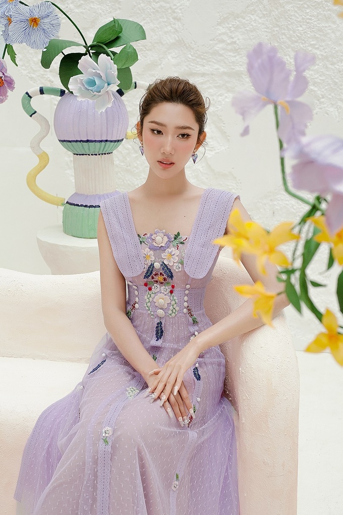 Hơn nữa, người đẹp còn khoác lên mình bộ váy đầy hơi thở mùa xuân với các đóa hoa đủ màu sắc được thêu tay trên nền vải trắng và tím.