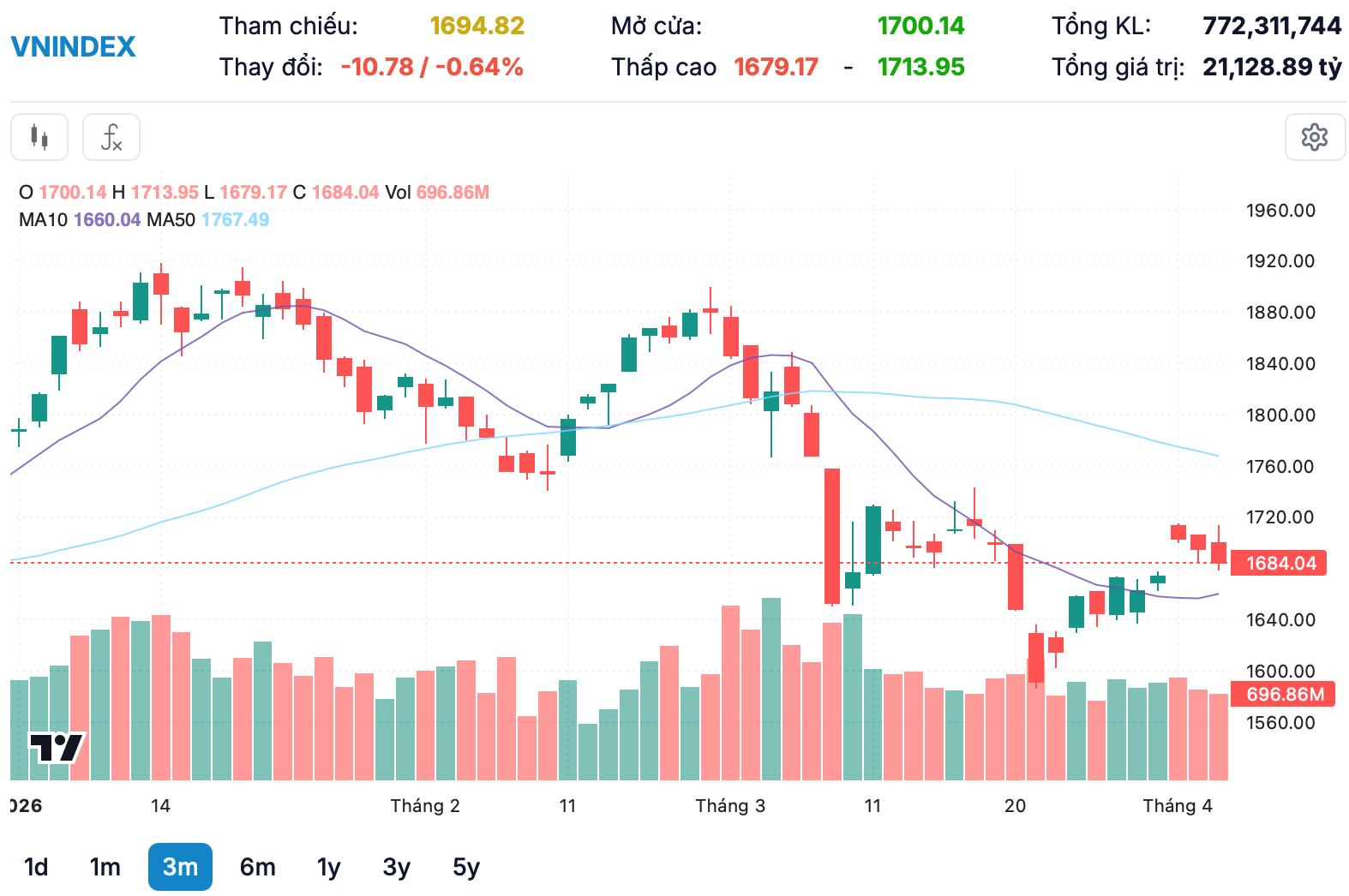 Kết thúc phiên giao dịch hôm nay, sàn HOSE có 78 mã tăng và 233 mã giảm, VN-Index giảm 10,78 điểm (-0,64%), xuống 1.684,04 điểm. Tổng khối lượng giao dịch đạt hơn 772,3 triệu đơn vị, giá trị đạt 21.128,9 tỷ đồng, giảm 13% về khối lượng và 23% về giá trị so với phiên hôm qua. Giao dịch thỏa thuận đóng góp hơn 75,4 triệu đơn vị, giá trị đạt 2.259 tỷ đồng.