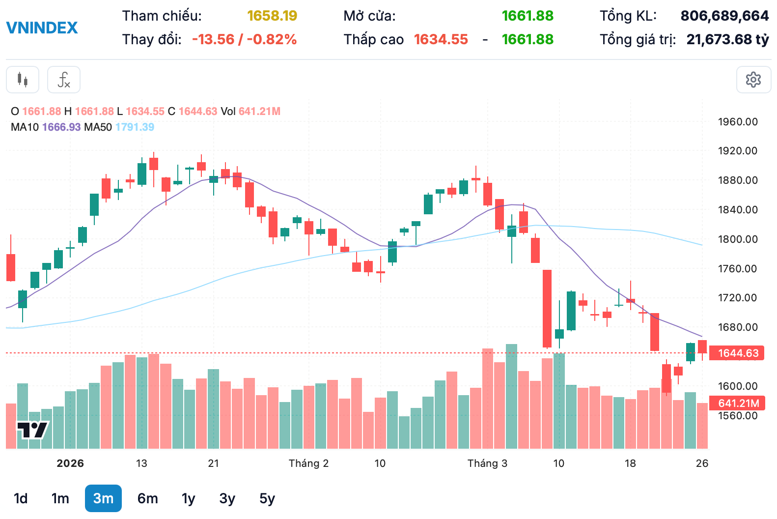 Sau chuỗi phiên hồi phục ấn tượng, VN-Index hôm nay (ngày 26/3) quay đầu điều chỉnh khi áp lực chốt lời diện rộng đẩy chỉ số lùi về vùng 1.640 điểm. Dù sắc đỏ chiếm ưu thế xuyên suốt phiên, sự bứt phá của nhóm phân bón cùng lực cầu tại các mã trụ cuối ngày đã giúp thị trường tránh được một phiên giảm sâu.