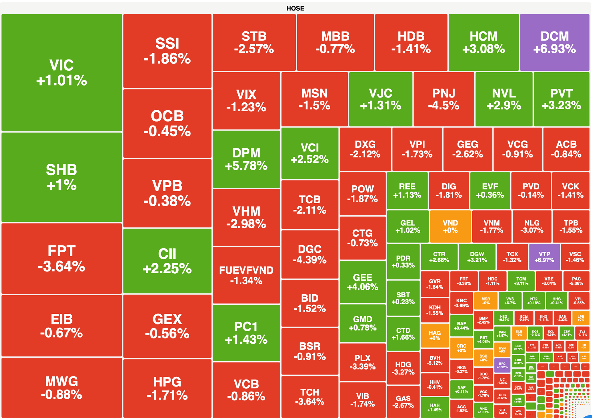 Kết thúc phiên giao dịch, sàn HOSE có 123 mã tăng và 207 mã giảm, VN-Index giảm 13,56 điểm (-0,82%) xuống 1.644,63 điểm. Tổng khối lượng giao dịch đạt 806,7 triệu đơn vị, giá trị đạt 21.673 tỷ đồng, giảm 9,6% về khối lượng và 4,2% về giá trị so với phiên hôm qua. Giao dịch thỏa thuận đóng góp 165,5 triệu đơn vị, giá trị đạt hơn 4.523 tỷ đồng.