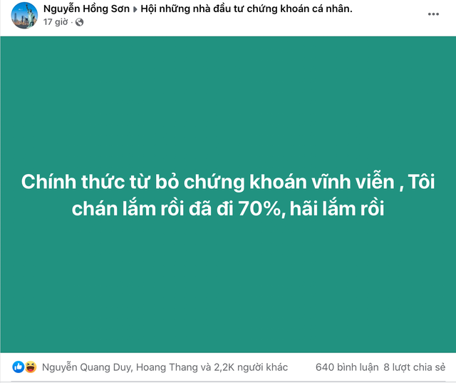 Trên một group chứng khoán, tài khoản Nguyễn Hồng Sơn viết: “Chính thức từ bỏ chứng khoán vĩnh viễn, tôi chán lắm rồi, tài khoản đã âm 70%. Hãi lắm rồi”. Câu viết ngắn gọn nhưng nhận về vài ngàn lượt like vì sự đồng cảm, cho thấy tâm trạng của nhà đầu tư bị thua lỗ nặng, chán nản muốn buông bỏ và rời xa chứng khoán. Lướt các diễn đàn, đội nhóm chứng khoán những lời than vãn, bức ảnh chụp tài khoản thua lỗ 10-40% rất nhiều. Tuần qua, nhà đầu tư thua lỗ mất tiền là thật.