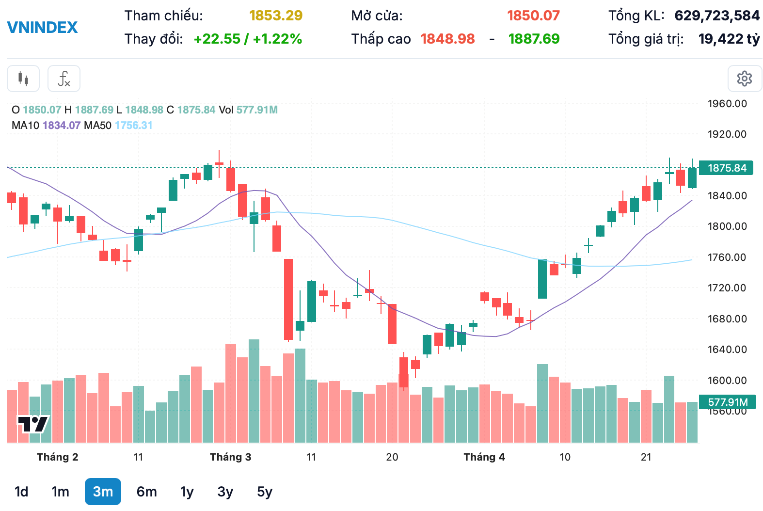 Kết thúc phiên giao dịch, sàn HOSE có 107 mã tăng và 210 mã giảm, VN-Index tăng 22,55 điểm (+1,22%), lên 1.875,84 điểm. Tổng khối lượng giao dịch đạt hơn 629,7 triệu đơn vị, giá trị đạt 19.422 tỷ đồng, giảm nhẹ 6% về khối lượng và tương đương về giá trị so với phiên cuối tuần trước. Giao dịch thỏa thuận đóng góp hơn 51,7 triệu đơn vị, giá trị đạt 1.383 tỷ đồng.