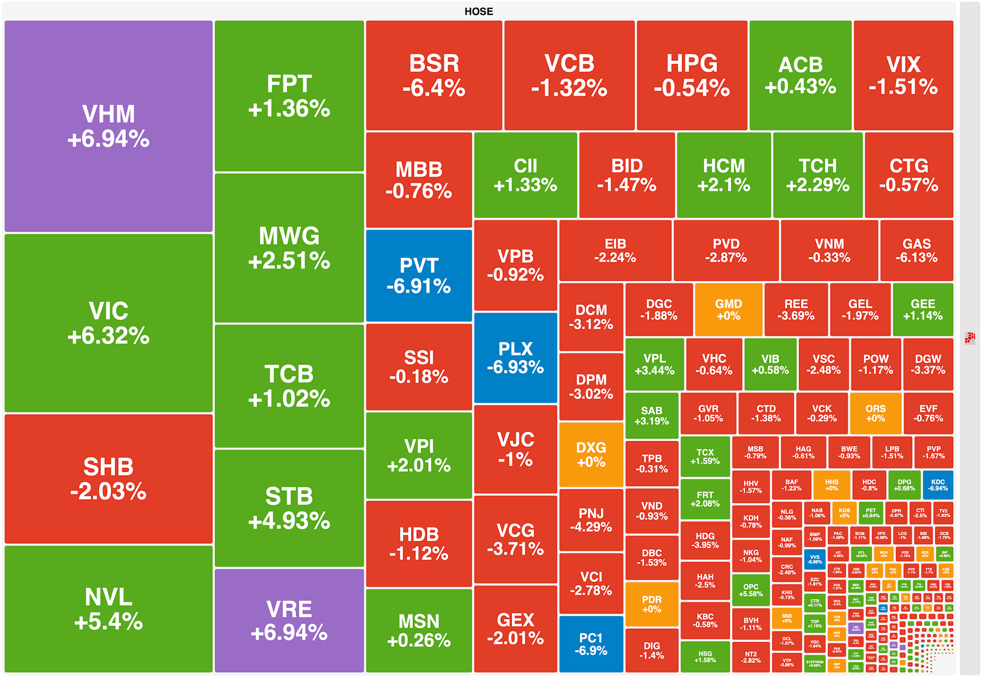 Sức nóng từ “họ” Vin lan tỏa mạnh mẽ, cộng hưởng cùng lực kéo từ các mã trụ như SAB, FPT, MSN và đặc biệt là sự đồng thuận của nhóm ngân hàng, chứng khoán với các đại diện STB, TCB và HCM. Diễn biến này giúp VN-Index dễ dàng bù đắp áp lực giảm từ nhóm dầu khí hay các mã VJC, PNJ.