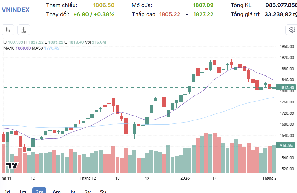 Thị trường mở cửa phiên hôm nay với tâm thế thận trọng, chỉ số VN-Index chủ yếu vận động giằng co trong biên độ hẹp quanh ngưỡng 1.815 điểm xuyên suốt phiên sáng. Dòng tiền luân chuyển khéo léo giúp các nhóm ngành như dầu khí (GAS, OIL), vận tải biển (GMD, VOS) cùng một số đại diện ngành Ngân hàng và chứng khoán giữ được sắc xanh ổn định. Thanh khoản duy trì tương đương phiên trước đó, cho thấy trạng thái điều tiết cung – cầu đang diễn ra nhịp nhàng khi thị trường nỗ lực thiết lập vùng hỗ trợ vững chắc trong khoảng 1.800-1.830 điểm.