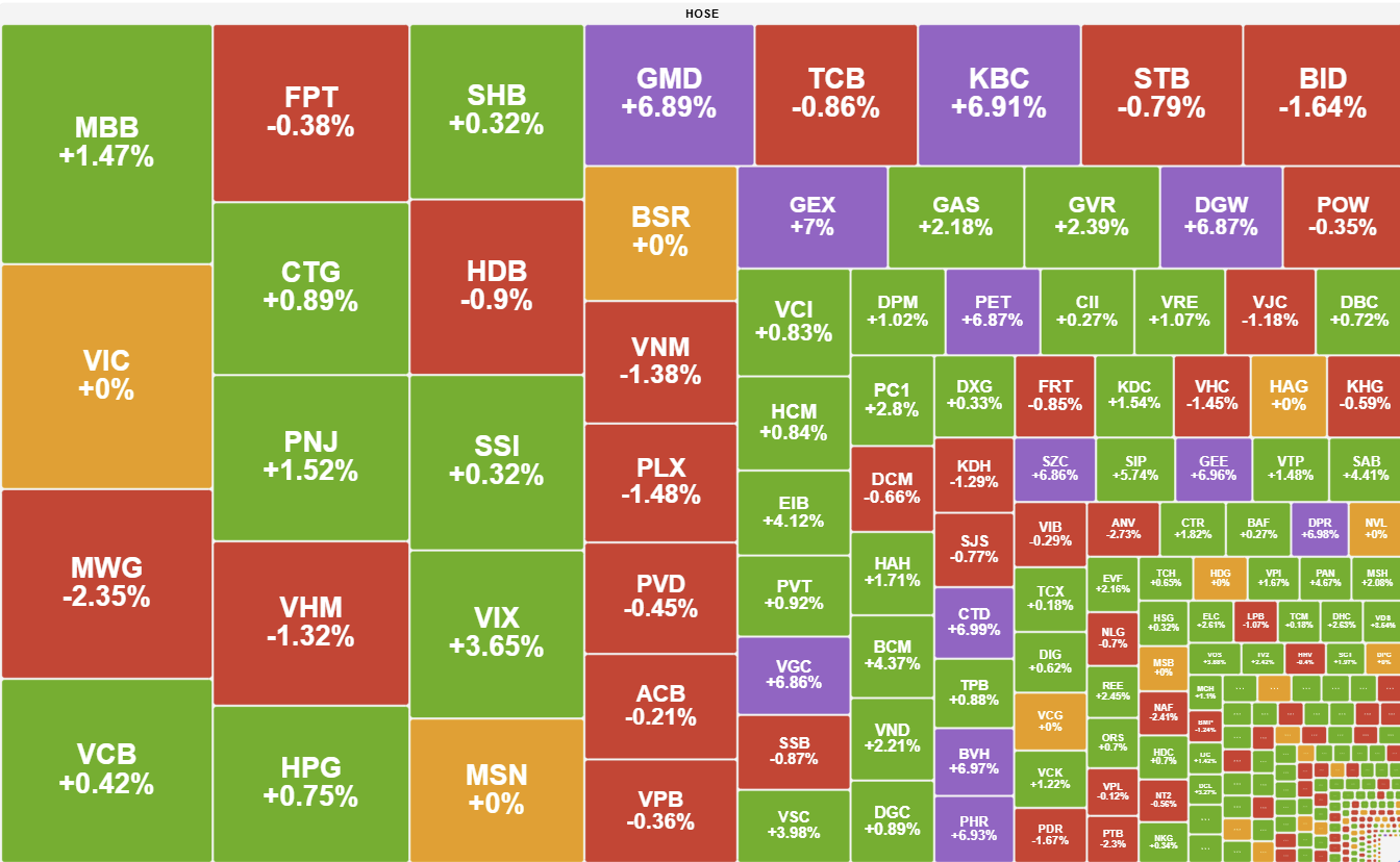 Sàn HOSE có 191 mã tăng và 127 mã giảm, VN-Index tăng 6,90 điểm (+0,38%), lên 1.813,4 điểm. Tổng khối lượng giao dịch đạt hơn 982,8 triệu đơn vị, giá trị đạt 33.012,7 tỷ đồng, tương đương so với phiên hôm qua. Giao dịch thỏa thuận đóng góp hơn 69,3 triệu đơn vị, giá trị đạt 2.468 tỷ đồng.
