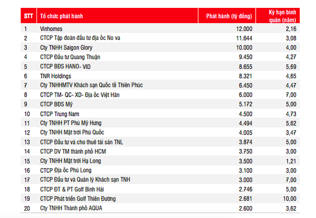 Một số lô phát hành lớn có kỳ hạn dài là: Công ty Cổ phần Thương mại – Quảng cáo – Xây dựng – Địa ốc Việt Hân (6.000 tỷ đồng, 7 năm) ; Công ty Cổ phần Đầu tư và Quản lý khách sạn TNH (3.000 tỷ đồng, 7 năm); Công ty Cổ phần Tổng hợp Thế giới Xanh (1.750 tỷ đồng, 6 năm); Công ty Cổ phần Bất động sản HANO-VID (8.655 tỷ đồng; 5,7 năm)…
