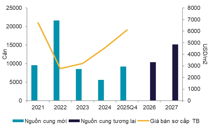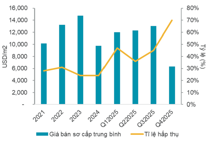 Giá bán sơ cấp trung bình trong Q4 2025, đạt khoảng 6.113 USD/m2, tăng mạnh khoảng 16% so với Q3 2025 và tăng khoảng 65% so với cùng kỳ năm 2024, do các dự án mới luôn có định vị cao hơn dự án cũ.