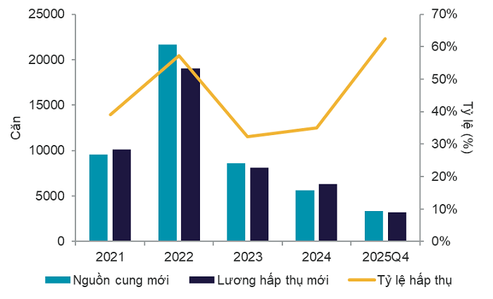 Trong Q4 2025, thị trường ghi nhận lượng hấp thụ mới khoảng 3.196 căn, tăng 19% so với cùng kỳ quý trước, và khoảng 10% so với cùng kỳ năm trước. Lượng giao dịch mới gần như tương đương nguồn cung mở bán, trong khi tỷ lệ hấp thụ tăng mạnh lên mức cao nhất trong năm 2025 (khoảng 62%).