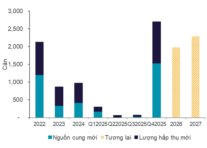 Trong Q4 2025, lượng hấp thụ mới khoảng 1.167 căn, tăng hơn 20 lần so với Q3 2025, và cùng kỳ năm ngoái, cho thấy sức hút cực lớn của loại hình này khi có nguồn cung mới từ các dự án lớn.