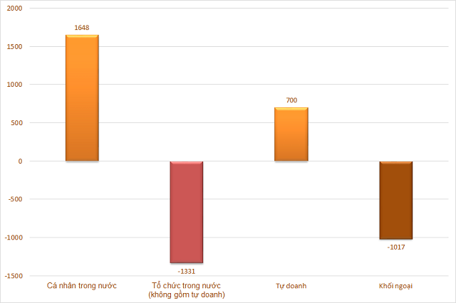 Tổ chức trong nước (không gồm tự doanh) giao dịch tiêu cực trở lại sau tuần mua ròng mạnh trước đó. Cụ thể, dòng vốn này bán ròng 1.331 tỷ đồng. Dù vậy, nếu tính theo phương thức khớp lệnh thì giá trị bán ròng giảm còn hơn 675 tỷ đồng.