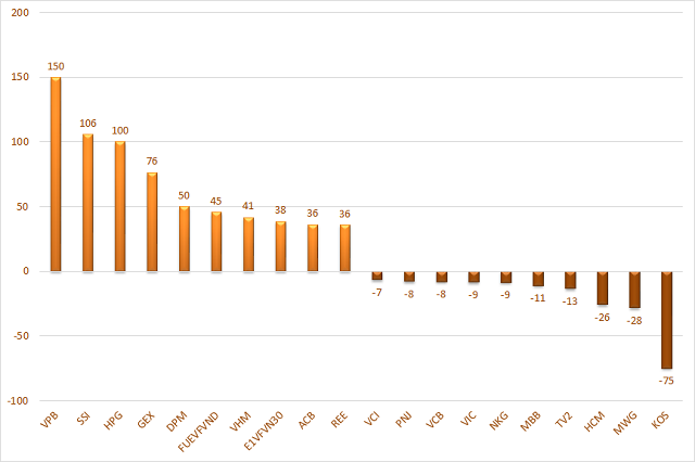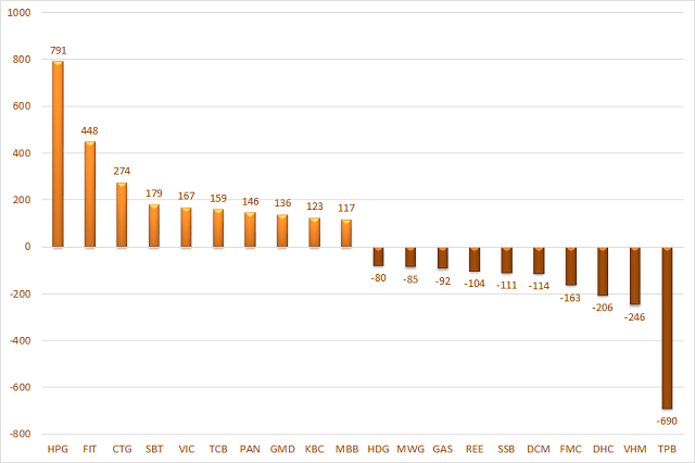 Nhà đầu tư cá nhân trong nước mua ròng mạnh nhất mã HPG với giá trị 791 tỷ đồng. Tiếp sau đó, FIT được mua ròng 448 tỷ đồng. CTG và SBT đứng sau với giá trị mua ròng lần lượt 274 tỷ đồng và 179 tỷ đồng. Trong khi đó, TPB bị bán ròng mạnh nhất với 690 tỷ đồng. VHM và DHC bị bán ròng lần lượt 246 tỷ đồng và 206 tỷ đồng.