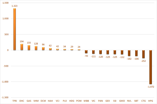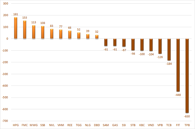 TPB là cổ phiếu bị dòng vốn từ tổ chức (không gồm tự doanh) bán ròng mạnh nhất với 630 tỷ đồng. Tiếp sau đó là FIT với 448 tỷ đồng. Trong khi đó, HPG được mua ròng mạnh nhất với 181 tỷ đồng. FMC và MWG được mua ròng lần lượt 153 tỷ đồng và 113 tỷ đồng.