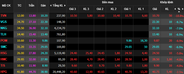 Ở nhóm Bluechips, VNM giữ được sắc xanh đến trước phiên ATC, tuy nhiên sau đó cũng quay đầu giảm 0,3% khi đóng cửa. Trong khi đó, 13 mã rổ VN30 “nằm sàn” gồm MWG, PLX, TCB, BID, BVH, CTG GVR, KDH, PNJ, SSI, STB, VPB, POW, còn lại 17 mã giảm mạnh.