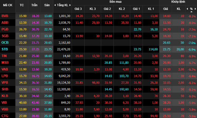 Về cuối phiên, diễn biến thị trường vẫn kém tích cực dưới áp lực bán tăng mạnh. Hàng loạt nhóm ngành bị bán mạnh “không thương tiếc” như Chứng khoán, Ngân hàng, Bất động sản, Thép…khiến hàng loạt mã giảm sâu, thậm chí giảm sàn “trắng bên mua”.
