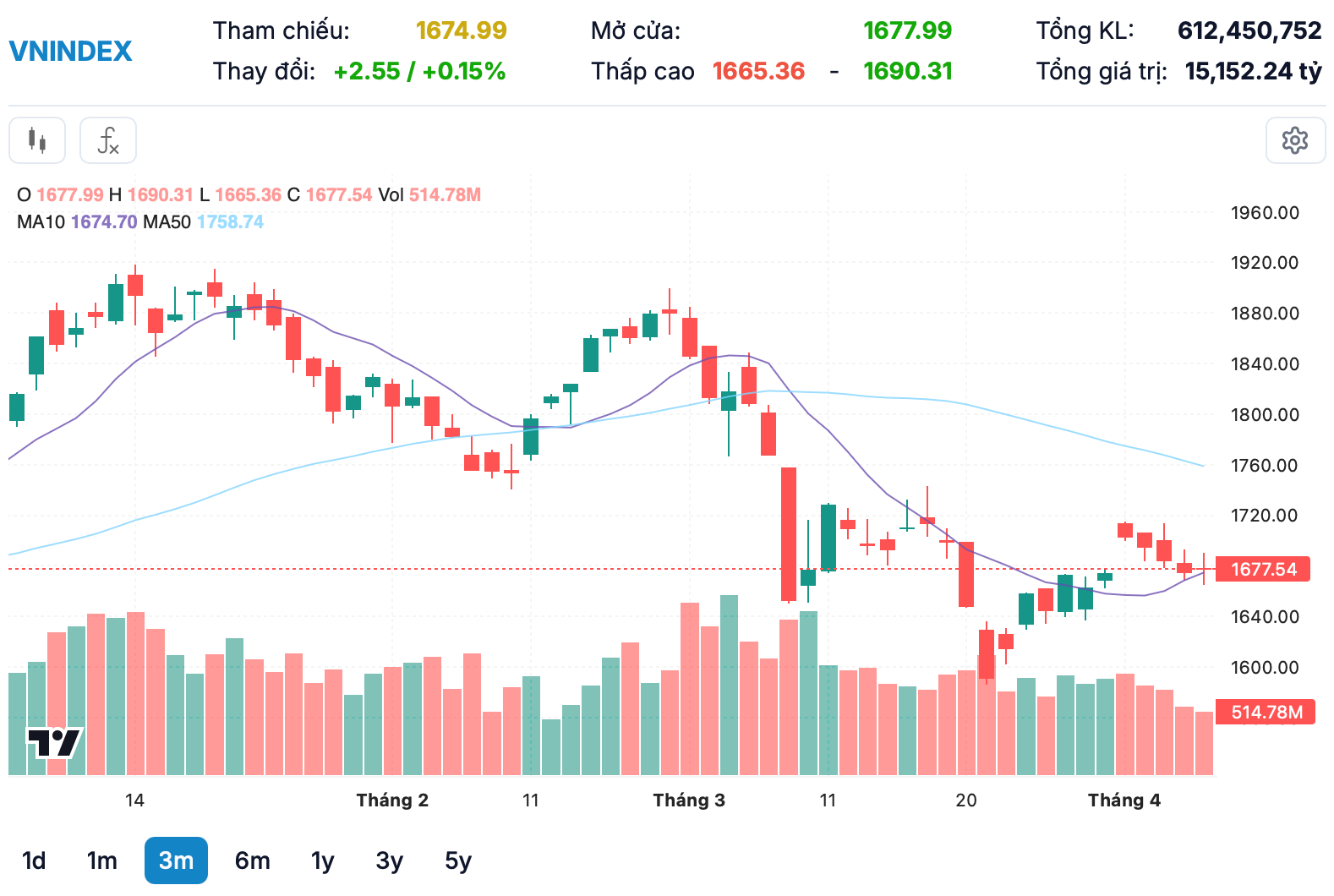 Kết thúc phiên giao dịch, sàn HOSE có 161 mã tăng và 140 mã giảm, VN-Index tăng 2,55 điểm (+0,15%), lên 1.677,54 điểm. Tổng khối lượng giao dịch đạt hơn 612,5 triệu đơn vị, giá trị đạt 15.152,2 tỷ đồng, giảm hơn 8% về khối lượng và 15% về giá trị so với phiên hôm qua. Giao dịch thỏa thuận đóng góp hơn 97,6 triệu đơn vị, giá trị đạt 1.770 tỷ đồng.