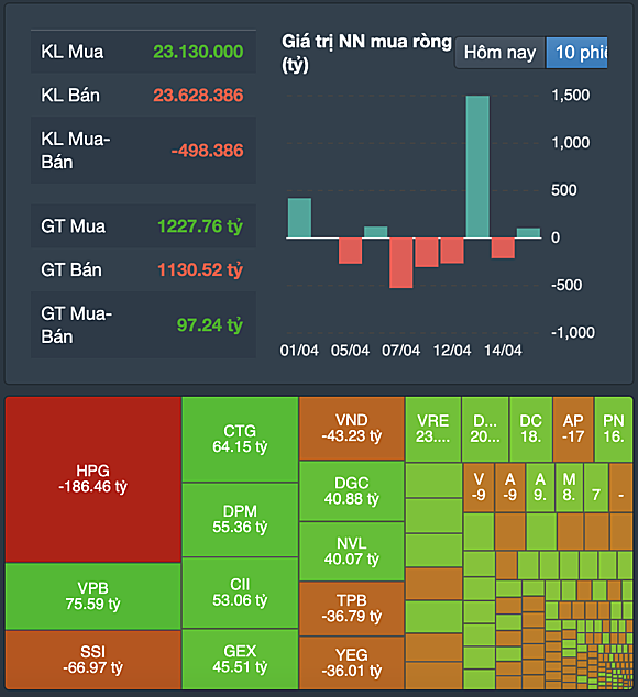 Thị trường chứng khoán biến động có phần tiêu cực ở phiên 14/4 khi nhiều cổ phiếu trụ cột giảm sâu vào cuối phiên. Thanh khoản thị trường tiếp tục giảm với tổng giá trị khớp lệnh đạt 19.203 tỷ đồng, giảm 15% so với phiên trước, trong đó, giá trị khớp lệnh riêng sàn HoSE giảm 12% xuống còn 17.238 tỷ đồng. Khối ngoại bán ròng trở lại 218 tỷ đồng ở sàn HoSE.