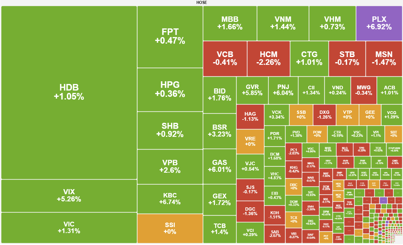 Bước sang phiên chiều, áp lực rung lắc trở nên rõ rệt hơn dưới tác động từ khối lượng bán lớn tập trung ở một số cổ phiếu riêng lẻ như SAB, MSN và DGC. Trong bối cảnh thị trường đang tìm điểm cân bằng, nhóm cổ phiếu năng lượng với tâm điểm là PLX và GAS đã bất ngờ ghi nhận mức tăng trưởng mạnh mẽ kể từ giữa phiên. Sự bứt phá của nhóm này không chỉ đóng vai trò “cứu cánh” cho chỉ số mà còn tạo động lực quan trọng giúp VN-Index nỗ lực vươn lên trở lại về phía cuối ngày, khép lại một phiên giao dịch đầy biến động nhưng vẫn giữ được sự chủ động của dòng tiền.