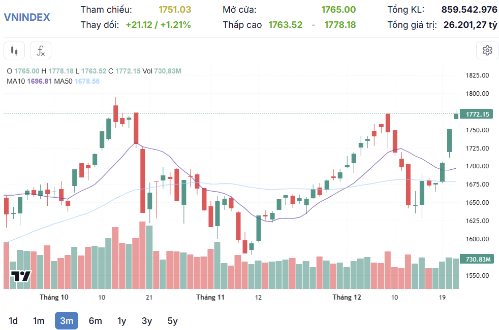 Phiên hôm nay (ngày 23/12), VN-Index vượt mốc 1.770 điểm nhờ sức bật từ nhóm Vingroup với VIC với VHM tăng trần, bên cạnh đó là đà tăng của STB trước thông tin bổ nhiệm nhân sự cấp cao.