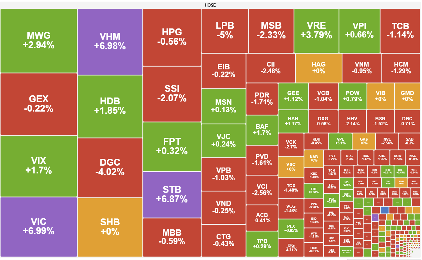 Kết thúc phiên giao dịch, sàn HOSE có 102 mã tăng và 212 mã giảm, VN-Index tăng 21,12 điểm (+1,21%), lên 1.772,15 điểm. Tổng khối lượng giao dịch đạt hơn 859,5 triệu đơn vị, giá trị đạt 26.201,3 tỷ đồng, giảm hơn 12% về khối lượng và 14% về giá trị so với phiên hôm qua. Giao dịch thỏa thuận đóng góp hơn 130,3 triệu đơn vị, giá trị đạt 3.668 tỷ đồng.