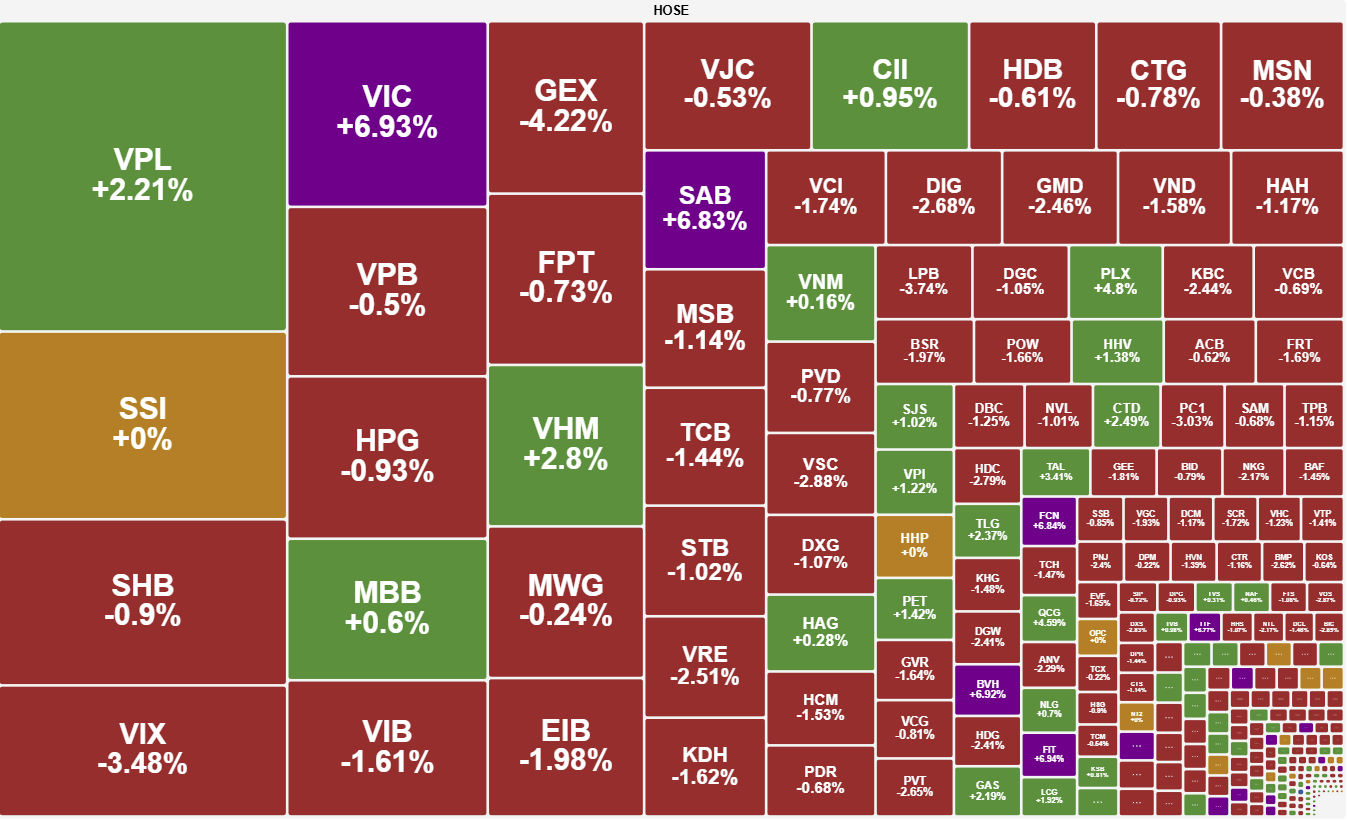 Tuy nhiên, áp lực bán ngay lập tức xuất hiện, tập trung chủ yếu ở nhóm ngân hàng, tiêu dùng và các mã vốn hóa lớn như HPG, VJC. Dù vậy, dòng tiền vẫn tìm đến một số nhóm ngành khác, tạo điểm nhấn với SAB tăng trần, VNM tăng 1,42%, HHV tăng 1,04% và CTD tăng 2,96%.