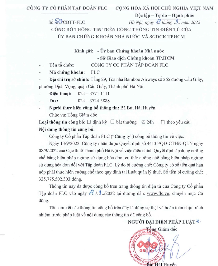 Ngày 13/9, Tập đoàn FLC nhận được quyết định số 44135/QĐ-CTHN-QLN ngày 8/9/2022 của Cục thuế TP. Hà Nội về việc cưỡng chế thuế bằng biện pháp ngừng sử dụng hóa đơn đối với Tập đoàn FLC.