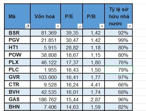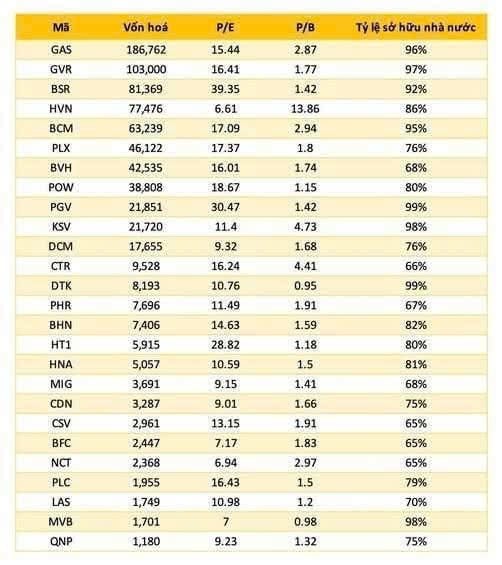 Đơn cử, Tổng Công ty Phát điện 3 (PGV) và Tổng Công ty Điện lực TKV (DTK) có tỷ lệ sở hữu nhà nước lên tới 99%. Tương tự, tại Tập đoàn Công nghiệp Cao su Việt Nam (GVR) vốn hóa hơn 100.000 tỷ đồng nhưng Nhà nước nắm tới 97%, hay Tổng Công ty Khí Việt Nam (GAS) với vốn hóa gần 187.000 tỷ đồng cũng ghi nhận tỷ lệ sở hữu nhà nước ở mức 96%.