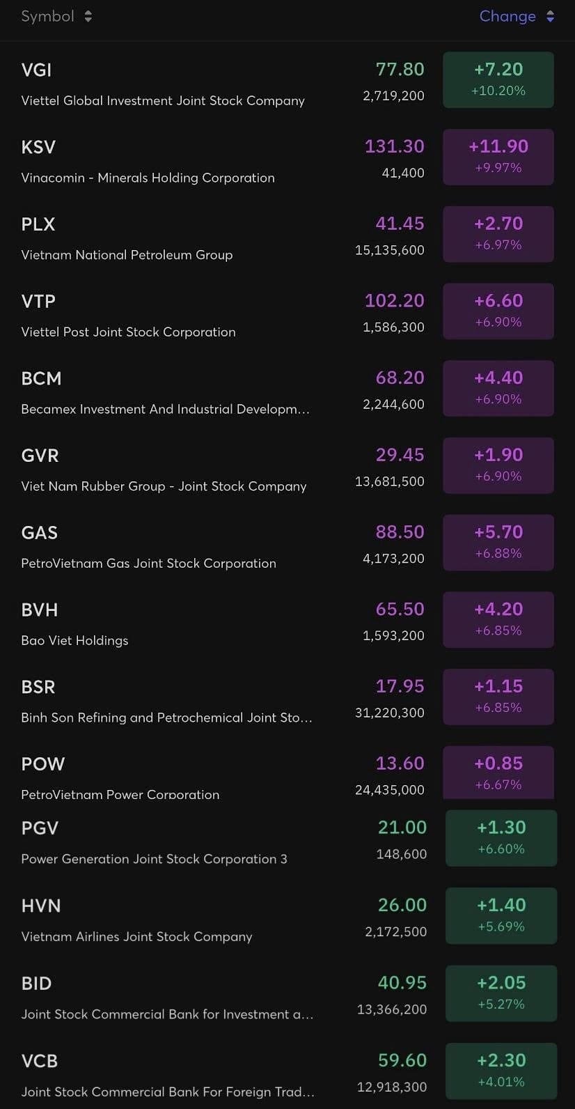 Cùng xu hướng, BVH (Tập đoàn Bảo Việt) cũng có phiên tăng trần thứ hai, chốt tại 65.500 đồng/cp – mức cao nhất 5 năm. Đà hưng phấn còn kéo theo hàng loạt “ông lớn” như KSV (tăng trần phiên thứ 4), GVR, BSR, PLX hay BCM đồng loạt tăng hết biên độ.