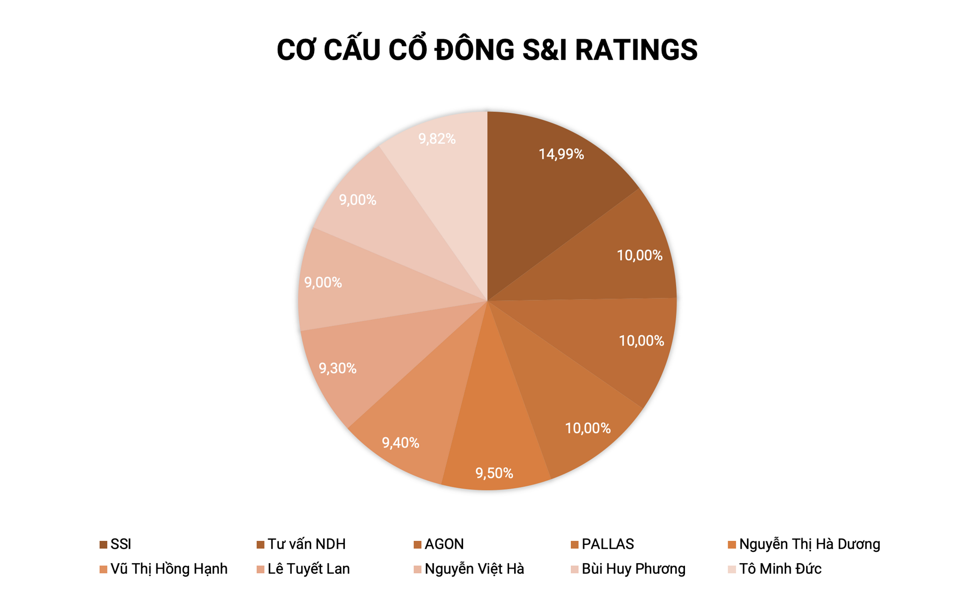 Tuy nhiên, tính đến thời điểm hiện tại, theo thông tin S&I Ratings công bố trên website chính thức, Chứng khoán SSI đang là cổ đông lớn nhất của doanh nghiệp này với tỷ lệ sở hữu 14,99% vốn điều lệ. Bên cạnh đó, còn có 3 nhà đầu tư tổ chức sở hữu vốn của S&I Ratings, bao gồm Công ty TNHH Tư vấn NDH, Công ty CP AGON và Công ty CP PALLAS, mỗi bên nắm 10%. Đáng chú ý, Tư vấn NDH là doanh nghiệp nơi ông Nguyễn Duy Hưng làm Chủ tịch.