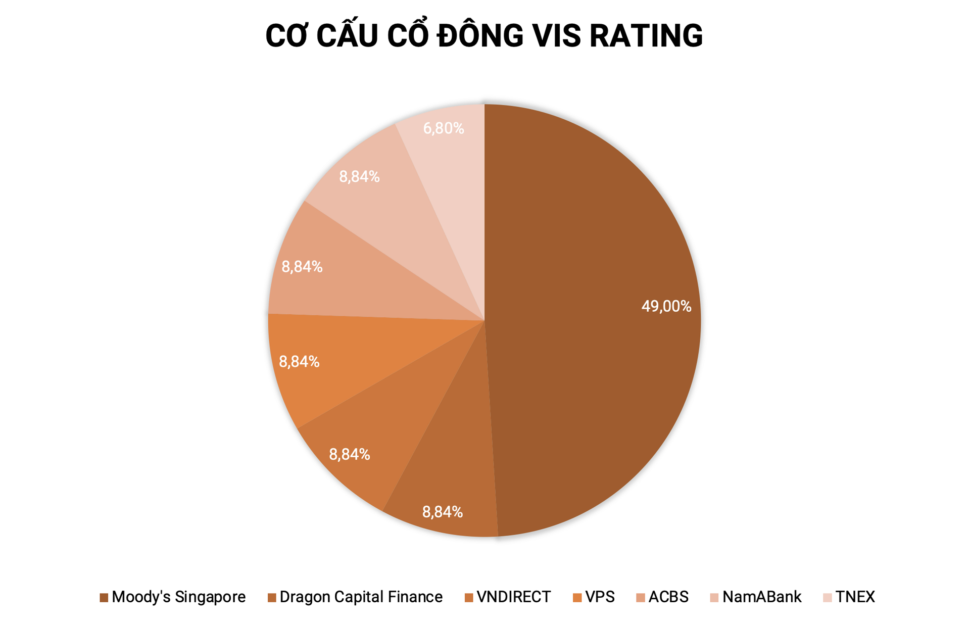 VIS Rating cũng là hãng xếp hạng tín nhiệm có quy mô lớn nhất hiện nay với số vốn điều lệ 103,14 tỷ đồng. Trong đó, tỷ lệ sở hữu của Moody’s Singapore Pte. Ltd. vẫn được giữ ở mức 49%, bằng thời diểm VIS Rating mới thành lập. Năm cổ đông sáng lập khác là Dragon Capital Finance Ltd, Công ty CP Chứng khoán VNDIRECT, Công ty TNHH Chứng khoán ACB (ACBS), Công ty TNHH MTV Quản lý nợ và Khai thác tài sản – Ngân hàng TMCP Nam Á NamABank, Công ty CP Chứng khoán VPS cùng nắm 8,84% (trước đó là 10,2%). Trong khi đó, cổ đông mới là Công ty Tài chính TNHH TNEX sở hữu tỷ lệ nhỏ nhất với 6,8%.