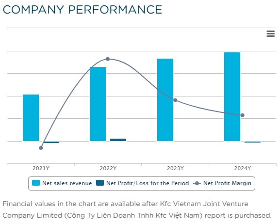 Trong báo cáo tài chính gần đây nhất, công ty ghi nhận doanh thu thuần tăng 7,82% trong năm 2024. Tổng tài sản của Công ty TNHH Liên doanh KFC Việt Nam tăng trưởng 12,5% trong cùng kỳ. Tỷ suất lợi nhuận ròng của Công ty TNHH Liên doanh KFC Việt Nam giảm 1,34% trong năm 2024.