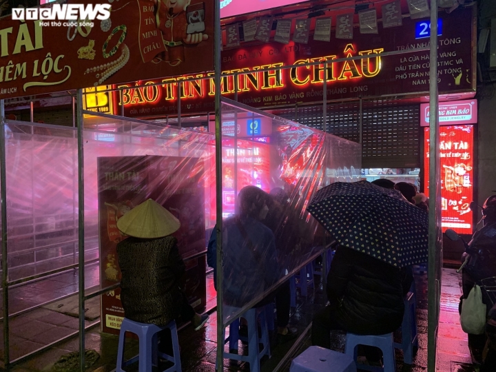Từ khoảng hơn 3h sáng 10/2, một số người dân đã bắt đầu có mặt trước cửa hàng Bảo Tín Minh Châu trên phố Trần Nhân Tông (phường Bùi Thị Xuân, quận Hai Bà Trưng, Hà Nội) để xếp hàng chờ mua vàng với mong muốn trở thành người đầu tiên sở hữu kim loại quý trong ngày vía Thần Tài.Ông Tô Hoà Bình (trú tại Đống Đa, Hà Nội) cho biết đã đến phố Trần Nhân Tông từ lúc hơn 3h và nhanh chóng chọn một chỗ xếp hàng trước tiệm vàng Bảo Tín Minh Châu.“Khi đi mua vàng trong ngày vía Thần Tài, may mắn nhất phải là người đầu tiên mua. Do đó, tôi đã dậy từ rất sớm và đến đây từ hơn 3h sáng để xếp hàng”, ông Bình chia sẻ.Quả nhiên, ông Bình đã chiếm được vị trí đầu hàng trong sáng nay. “Mấy năm nay rồi, năm nào tôi cũng dậy sớm để trở thành người đầu tiên mua vàng. Năm nào tôi cũng mua 2 chỉ vàng lấy may”, ông nói.Càng về sáng, càng có nhiều người đội mưa rét đến xếp hàng trước cửa hàng Bảo Tín Minh Châu.Lường trước được tình huống, doanh nghiệp đã bố trí vách ngăn phòng dịch, giữ an toàn cho khách trong lúc xếp hàng.Che ô, đội nón xếp hàng chờ mua vàng.Trước cửa Bảo Tín Minh Châu, vách ngăn chống dịch phân chia thành 7 hàng.Thời điểm 6h30, khi Bảo Tín Minh Châu bắt đầu mở bán, giá vàng miếng SJC là 61,57 – 62,50 (mua – bán).Khách tràn vào ngay khi cửa hàng mở cửa.Trái ngược với cảnh nhộn nhịp trước Bảo Tín Minh Châu, nhiều cửa hàng vàng thời điểm 6h30 vẫn vắng khách.