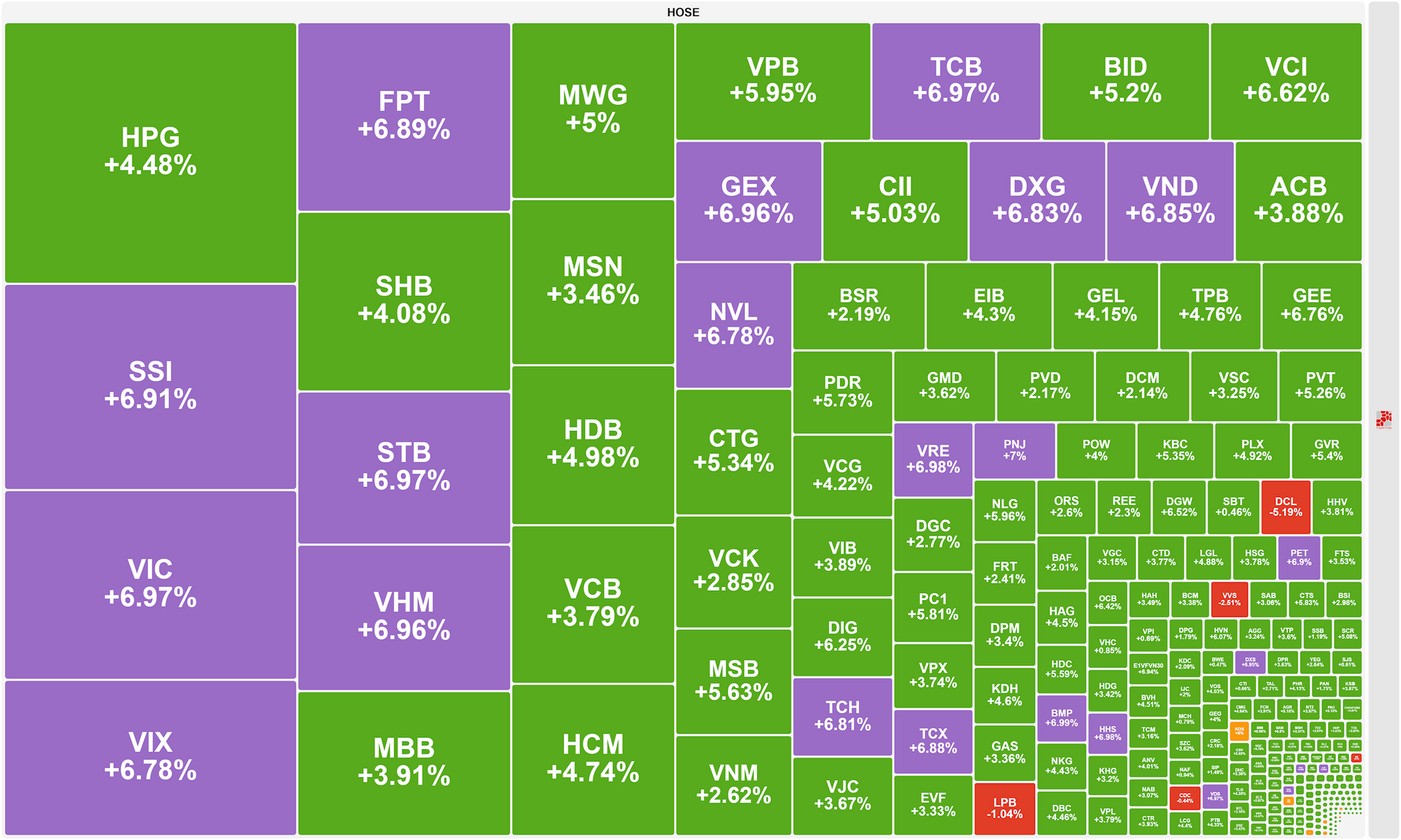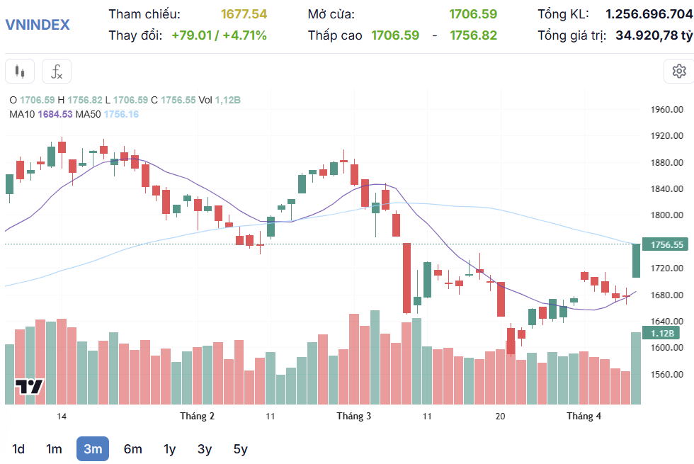 Kết thúc phiên giao dịch, VN-Index tăng 79,01 điểm (+4,71%) lên 1.756,55 điểm với 322 mã tăng, trong khi chỉ có 27 mã giảm, trong đó có 25 mã tăng kịch trần. Tổng khối lượng giao dịch đạt 1.256,7 triệu đơn vị, tương ứng tổng giá trị giao dịch đạt 34.920,8 tỷ đồng, tăng vọt 105,2% về khối lượng và 130,5% về giá trị so với phiên hôm qua. Trong đó, giao dịch thỏa thuận đóng góp 135 triệu đơn vị, giá trị đạt 4.525 tỷ đồng.