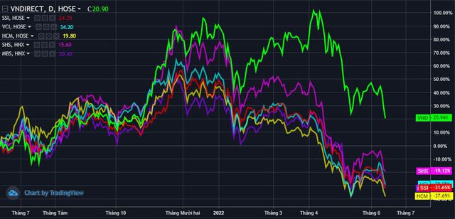 Hàng loạt cổ phiếu chứng khoán như SSI, HCM, VCI, MBS, SHS,… đều đã đánh mất thành quả tăng giá trong giai đoạn thăng hoa trước đó cùng mức giảm hàng chục % so với thời điểm cách đây 1 năm.
