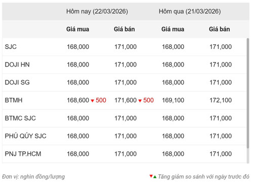 Cụ thể, tại thời điểm 14 giờ 30 phút ngày 22/3, Công ty Vàng bạc đá quý Sài Gòn (SJC) niêm yết giá vàng miếng SJC mua vào-bán ra ở mức 168-171 triệu đồng/lượng, giảm 11,6 triệu đồng so tuần trước đó. Chênh lệch mua-bán 3 triệu đồng/lượng.