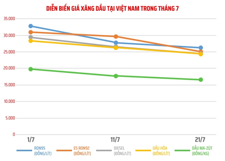 Trong kỳ điều hành giá ngày 11/7, xăng E5 RON92 có giá 27.788 đồng/lít, giảm 3.103 đồng/lít; xăng RON95-III giá 29.675 đồng/lít, giảm 3.088 đồng/lít. Dầu diesel giá 26.593 đồng/lít, giảm 3.022 đồng/lít; dầu hỏa giá 26.345 đồng/lít, giảm 2.008 đồng/lít; dầu mazut có giá 17.712 đồng/kg, giảm 2.010 đồng/kg.