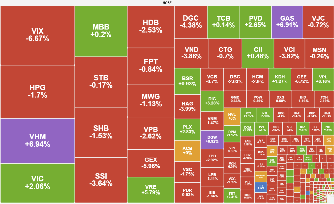 Bước sang phiên chiều, thị trường một lần nữa nỗ lực công phá mốc 1.800 nhưng kịch bản cũ lặp lại với cường độ mạnh hơn. Nhóm Ngân hàng (LPB, VPB) và Chứng khoán đồng loạt “quay xe”, đặc biệt là cú sốc VIX giảm sàn đã đẩy chỉ số rơi sâu dưới tham chiếu. Dù VHM, GAS và DGW đã nỗ lực hết mình với sắc tím kịch trần để níu giữ hy vọng, nhưng với 223 mã chìm trong sắc đỏ, VN-Index vẫn chưa thể có một ngày chào năm mới trọn vẹn.