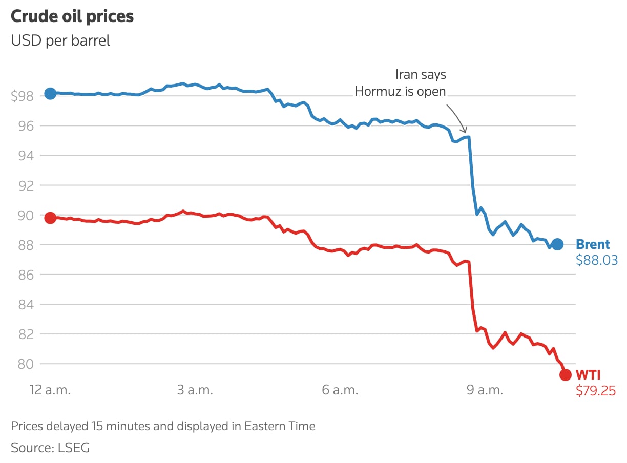 Giá dầu thô đã giảm xuống dưới 90 USD/thùng, tương đương mức giảm 11% khi Iran tuyên bố eo biển Hormuz ‘hoàn toàn mở cửa’, với hy vọng nguồn cung năng lượng có thể được khôi phục sau nhiều tuần gián đoạn.