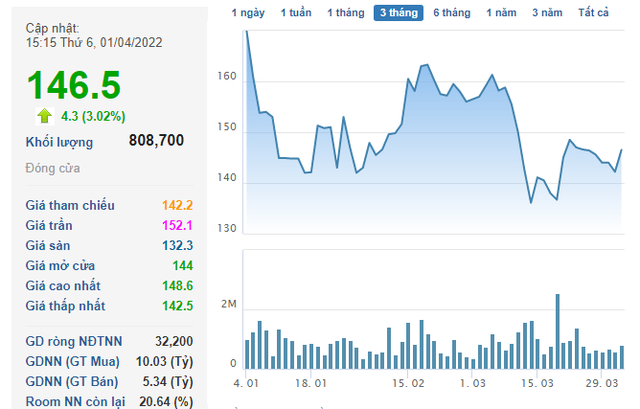 Còn xét về diễn biến cổ phiếu MSN, thị giá trong ba tháng đầu năm giảm gần 17%, chốt phiên 31/3 đạt 142.200 đồng/cổ phiếu.