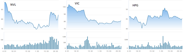 Cụ thể, VIC “rơi” từ vùng 100.000 đồng/cp hồi đầu năm về sát mức 81.000 đồng/cổ phiếu, tương ứng giảm khoảng 15%; NVL cũng giảm 12% sau ba tháng trong khi HPG diễn biến side-way khi giảm nhẹ 3% so với mức giá khởi đầu năm 2022.