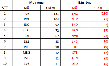 Trên sàn HNX, khối ngoại ngược chiều, trở lại xu hướng mua ròng với giá trị 164 tỷ đồng, theo đó họ mua ròng 149 tỷ đồng trên kênh khớp lệnh đồng thời mua ròng thêm hơn 15 tỷ đồng thỏa thuận