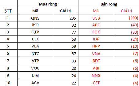 Trong khi đó, cổ phiếu SGB quý này dẫn đầu danh sách bán ròng khi bị khối ngoại bán ròng gần 310 tỷ đồng và phần lớn bán qua kênh thỏa thuận. Bên cạnh đó, ABC và FOX cũng bị bán ròng lần lượt 40 tỷ đồng và 30 tỷ đồng, một số cổ phiếu bị bán ròng từ nhà đầu tư ngoại trên UPCoM còn có ID[, HPP, VNA, BDT, ABI…